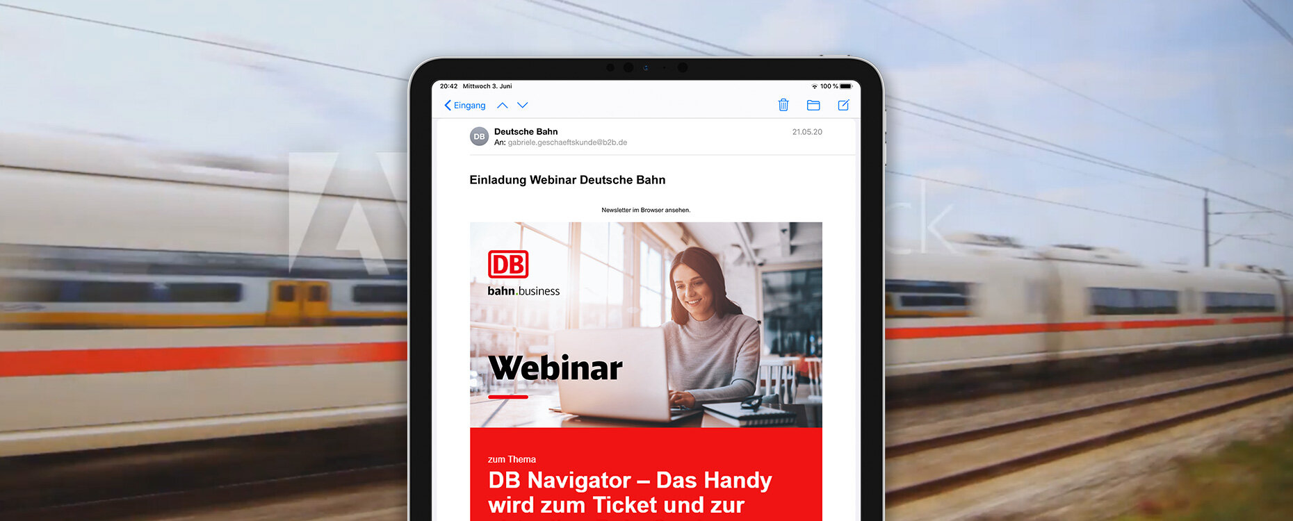 Der Bereich Kommunikation Partnermanagement der DB Vertrieb GmbH informiert Geschäftskunden im Bereich bahn.business konstant über aktuelle Entwicklungen und Vorteile. Die Kommunikation per E-Mail umfasst dabei alles von Angeboten über Umweltmaßnahmen bis zur essentiellen Vertragskommunikation.