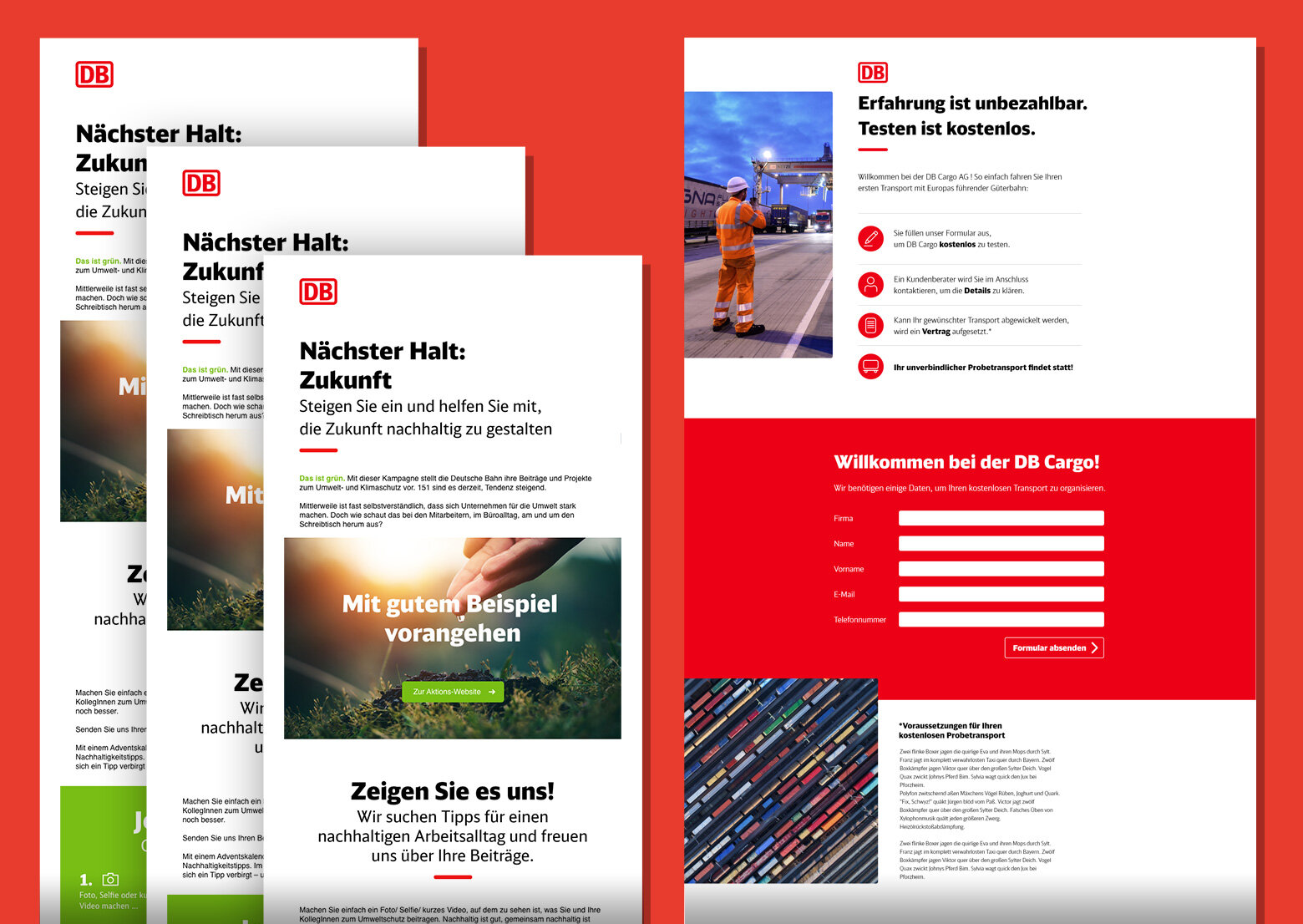 Die GCS steht dem Kunden sowohl konzeptionell, als auch in beratender Funktion seit der Systemeinführung im operativen Betrieb tatkräftig zur Seite. Darüber hinaus unterstützt die GCS den Kunden bei der Umsetzung effektiver, regelbasierter Kampagnen, bei der Kreation von Landingpages sowie auch bei verschiedenen gestalterischen Projekten. Darunter fallen nicht nur die grafische Überarbeitung von Newslettern, sondern auch der Entwurf von Kampagnenlogos, internen Grafiken und speziellen Aktionen. Von kreativen Design-Lösungen über die Umsetzung neuer Kommunikationsstrecken bis zur technischen Entwicklung eines Preference-Centers konnten wir uns als kompetenten und zuverlässigen Projektpartner für den Geschäftskundenbereich der Deutschen Bahn einbringen.