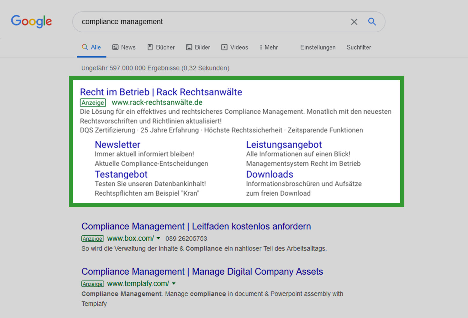 Eine nähere Analyse im Bereich von Compliance-Management-Systeme und des Marktumfelds zeigte auf Anhieb große Potentiale, um mittels Suchmaschinenwerbung Interessenten und Neukunden zu gewinnen. Im gleichen Werbekanal waren zudem bekannte Wettbewerber aktiv, denen man nicht alleine den Markt überlassen wollte, da "Recht im Betrieb" als Compliance-Lösung signifikant mehr Inhalte und damit Rechtssicherheit bietet.