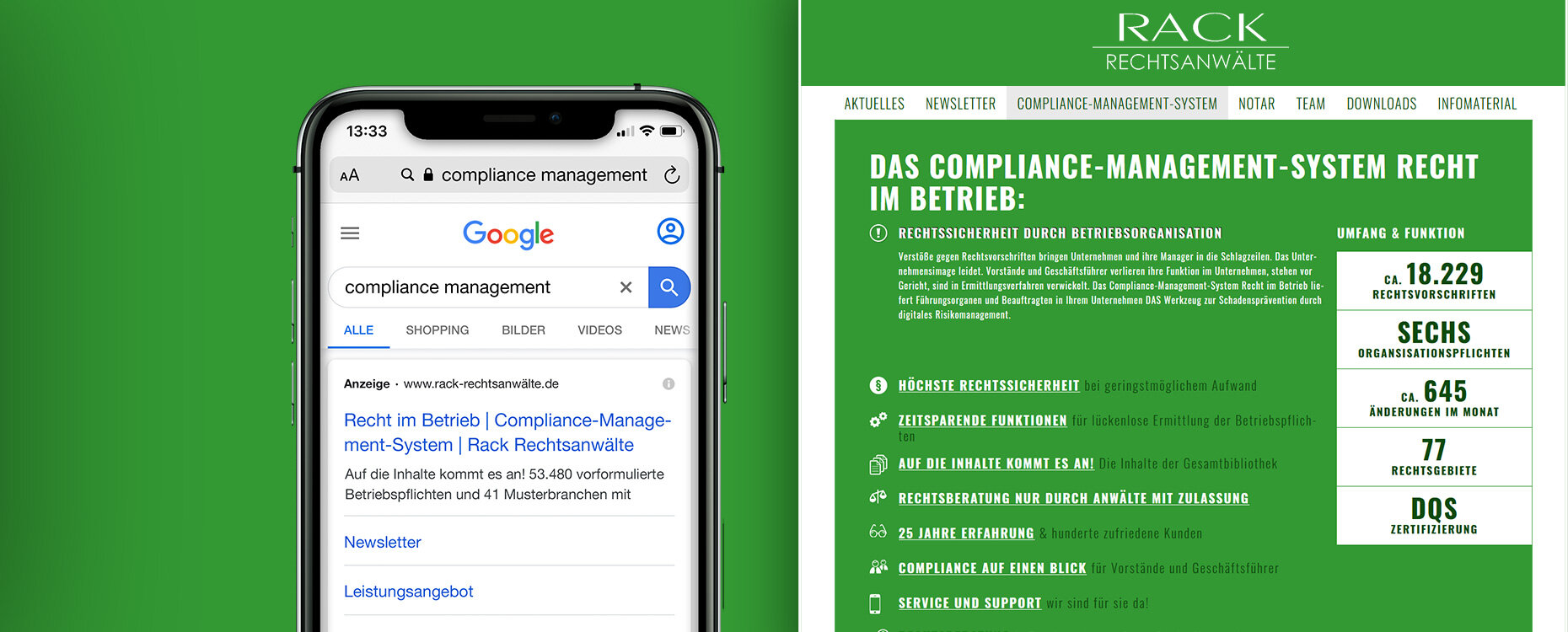 Die Anwaltskanzlei Rack in Frankfurt a. M. arbeitet seit 1992 erfolgreich an der betrieblichen Absicherung von Unternehmen und wurde 2002 mit dem Hessischen Innovationspreis für ihr Dialogsystem „Recht im Betrieb“ ausgezeichnet. Seitdem hat sich „Recht im Betrieb“ zu einem führenden und branchenübergreifenden Standardwerkzeug für ein effektives Compliance Management entwickelt. Die besondere Stärke von "Recht im Betrieb" ist dabei die umfangreiche und fortlaufend aktualisierte Datenbank aus Gesetzen, Verordnungen und sonstigen relevanten Regelwerken.